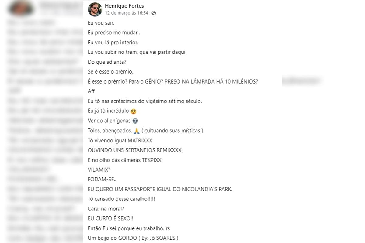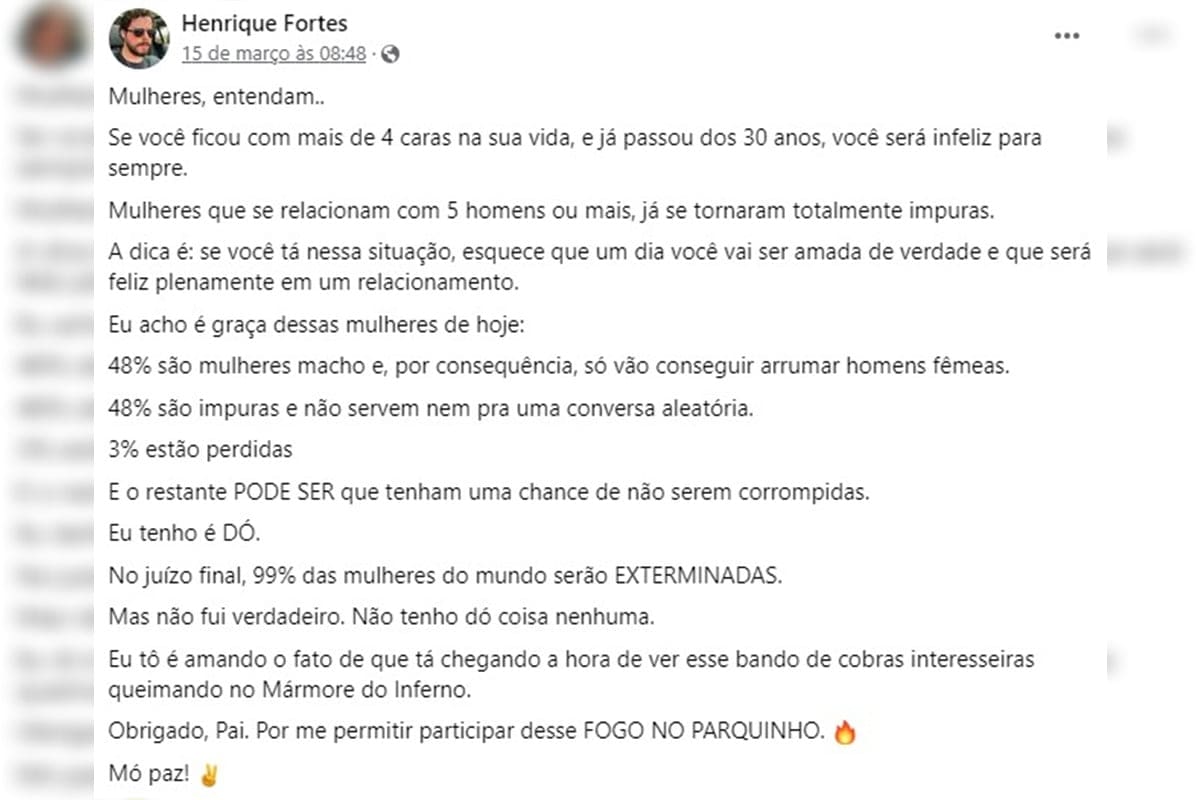 Nas redes sociais, Henrique Fortes publicava mensagens misóginas contra as mulheres. “Mulheres, entendam: se você se relacionou com mais de 4 homens na vida e já passou dos 30 anos, estará fadada à infelicidade eterna. Mulheres que tiveram 5 ou mais parceiros já são consideradas impuras”. Além disso, ele fez comentários de ódio direcionados às mulheres em geral, demonstrando um profundo desrespeito e desdém pelo gênero feminino.